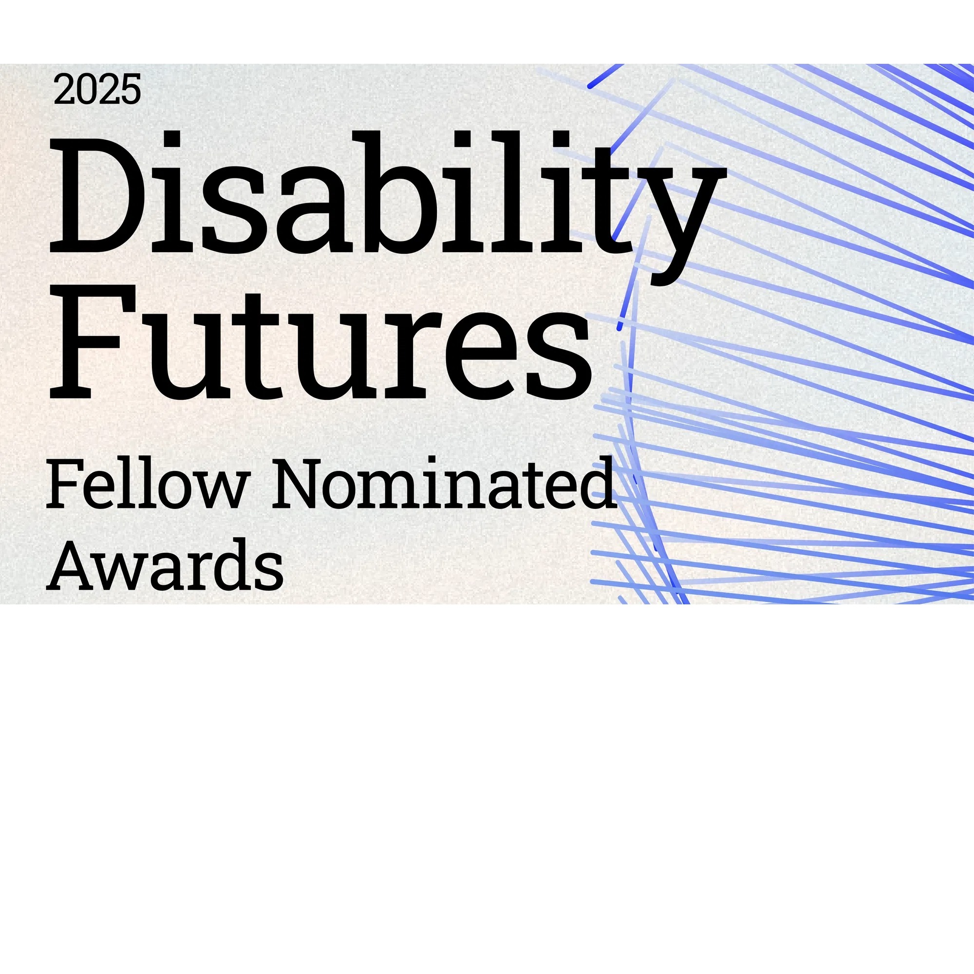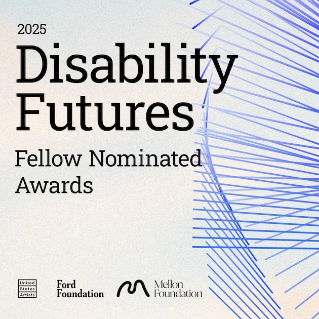 Alt text: The image features a background of a light blue color melded with white and graphic dark blue lines intersecting and coalescing on the right side. Text reads: 2025 Disability Futures Fellow Nominated Awards with the logos of United States Artists, the Ford Foundation, and Mellon Foundation on the bottom.